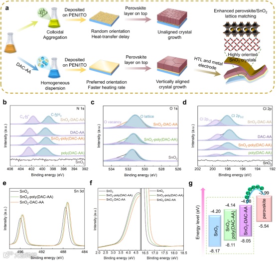 图1. DAC-AA修饰SnO2 ETLs的示意图和化学螯合作用。(a)高取向SnO2晶粒生长示意图和钙钛矿晶体生长。(b-e)N 1s,O 1s,Cl 2p和Sn 3d XPS图谱。(f-g)UPS图谱和能级排列示意图