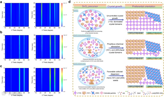 图2. SnO2纳米晶择优取向的表征。(a-c)原位XRD测试和(d)SnO2择优取向示意图