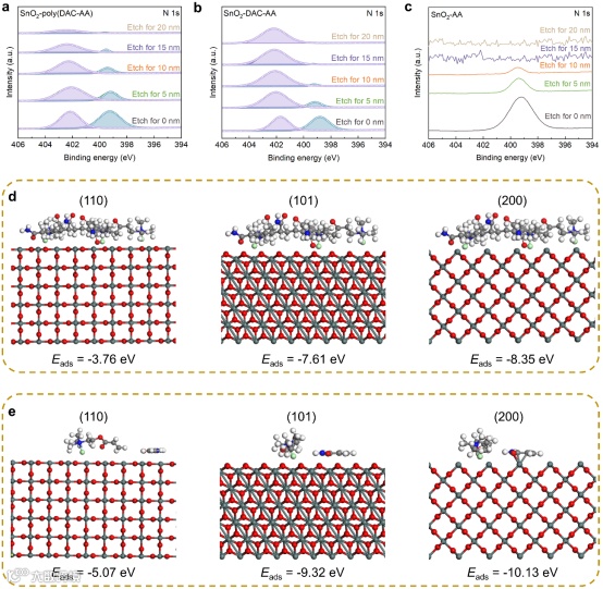图3. DAC-AA在SnO2薄膜内的梯度分布和结晶动力学。(a-c)不同刻蚀深度下的XPS测试和(d-e)DAC-AA在SnO2(110)、(101)和(200)表面吸附能。