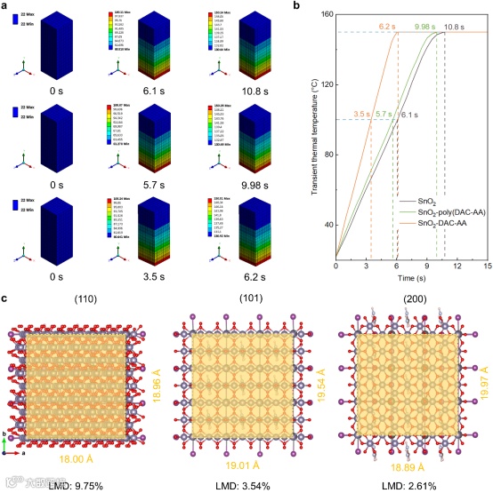 图4. PEN基底的热传递速率和晶格匹配度计算。(a)柔性PEN/ITO/SnO2/钙钛矿物理模型的热力学有限元分析和钙钛矿表面温度随时间变化的演变图和(b)热传递速率。(c)钙钛矿(100)面与SnO2 (110)、(101)和(200)晶格匹配计算。