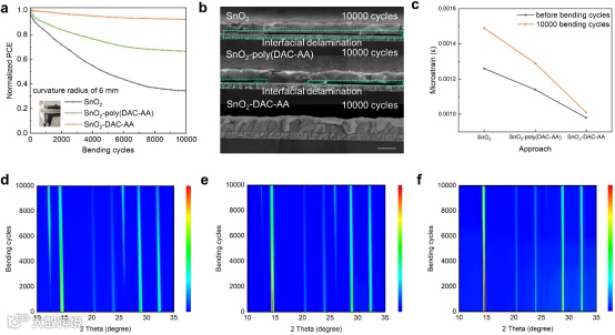 基于SnO2-DAC-AA的f-PSCs在空气环境中实现了23.87%(0.092 cm²)和22.41%(1 cm²)的效率,为全空气制备柔性器件的最高效率之一。器件在85 °C/85% RH下900小时后保持91.1%初始效率,6 mm弯曲半径下10,000次循环后效率维持92.5%。原位XRD和微应变分析表明,DAC-AA修饰的器件在弯曲后仍保持晶体结构完整性(微应变仅从0.98 × 10-3增大至1.01 × 10-3)。这种优异的机械稳定性源于SnO2晶面取向优化和钙钛矿/SnO2界面的强化学粘附。