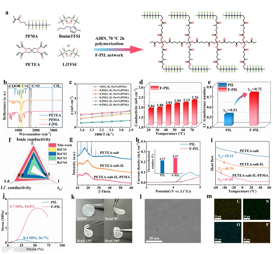本研究通过原位聚合法成功制备了氟化聚合物封装离子液体的准固态电解质(F-PIL),以PETEA/LiTFSI为基体,引入含氟功能侧链PFMA和增塑剂BmimTFSI,实现材料性能优化。实验表明,当LiTFSI浓度为0.5 M、PFMA含量为5 wt%时,F-PIL在室温下离子电导率达1.84 mS cm⁻¹,锂离子迁移数提升至0.72,显著高于传统聚合物电解质。XRD与DSC分析显示,BmimTFSI的引入促使体系结晶度降低并形成无定形主导的准固态结构,同时PFMA中C−F键赋予材料高氧化稳定性(4.3 V)及低温链段运动性(Tg=−47.09 ℃)。此外,F-PIL展现出优异的机械性能(断裂强度4.7 MPa,伸长率54%)和均匀致密结构,且弯曲无开裂。该研究通过功能组分协同设计,为兼具高离子传导性、稳定性和柔韧性的固态电解质开发提供了新策略。