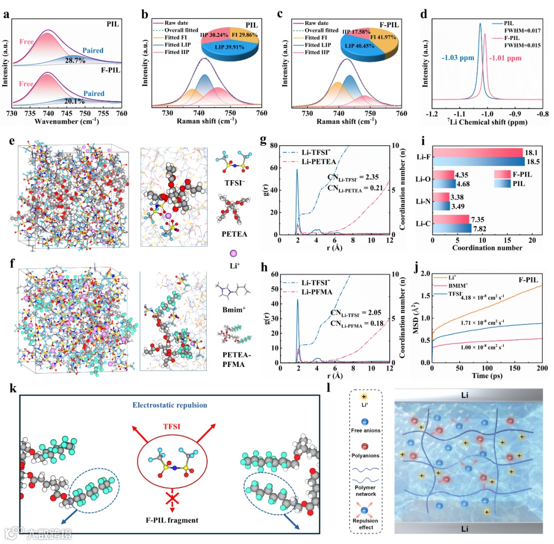 研究通过光谱分析(FTIR、拉曼、NMR)、DFT计算及分子动力学模拟,揭示了F-PIL中LiTFSI的高效解离机制与Li⁺传输优化路径。相较于传统PIL,F-PIL的Li⁺−TFSI⁻配位减弱(紧密离子对占比降低至17.58%),解离能下降(4.89 eV),游离Li⁺比例显著提升。NMR与MD模拟表明,Li⁺配位环境异质性减少,扩散系数提高50%(达4.18×10⁻⁸ cm² s⁻¹)。PFMA的氟化侧链通过静电排斥限制TFSI⁻迁移,同时Bmim⁺的受限运动进一步降低Li⁺传输阻力。这些协同效应使F-PIL兼具高Li⁺迁移率与低离子重组倾向,为设计高离子电导率、高稳定性的固态电解质提供了理论依据。