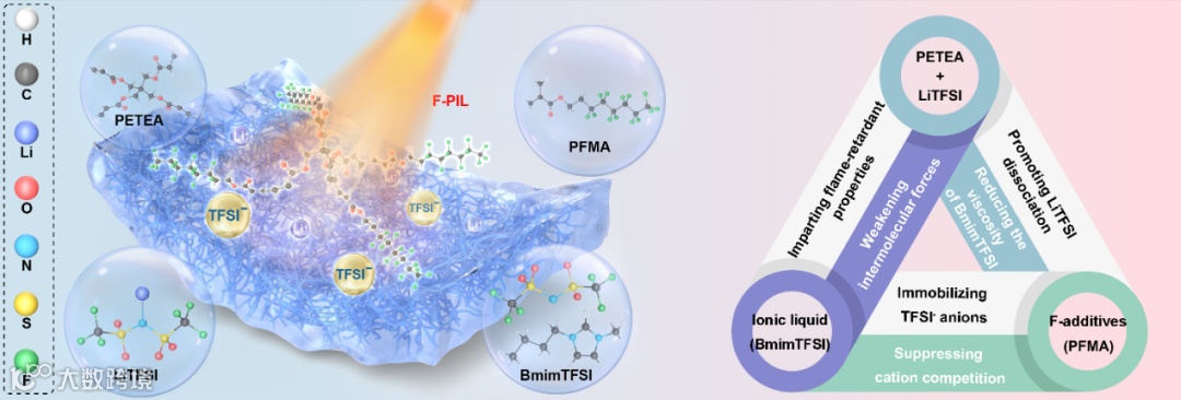 成都理工大学胡安俊研究员/龙剑平教授团队联合北京化工大学陈仕谋教授在能源材料顶级期刊Advanced Energy Materials(IF:24.4)发表题为“Decoupled Ion Transport via Triadic Molecular Synergy in Flame-Retardant Quasi-Solid Electrolytes for Safe Lithium Metal Batteries”的研究成果。该研究通过三元分子协同策略,构建了一种高性能阻燃准固态电解质(F-PIL):季戊四醇四丙烯酸酯-双(三氟甲基磺酰基)亚胺锂(LiTFSI)提供了结构框架,而作为增塑剂的IL(1-丁基-3-甲基咪唑双(三氟甲基磺酰基)亚胺,BmimTFSI)通过削弱分子间作用力软化了聚合物链,从而在赋予阻燃特性的同时提供了额外的离子传输途径。此外,添加剂(2-(全氟己基)乙基甲基丙烯酸酯,PFMA)的高电负性氟原子通过电子云迁移促进了LiTFSI的解离,同时固定了TFSI-阴离子,并通过PFMA-Bmim+的强配位抑制了阳离子竞争。因此,这一协同设计不仅优化了离子传输路径,还赋予了材料卓越的阻燃性能。本研究通过分子协同设计突破传统电解质性能瓶颈,为高安全性准固态锂金属电池的开发提供了创新范式。