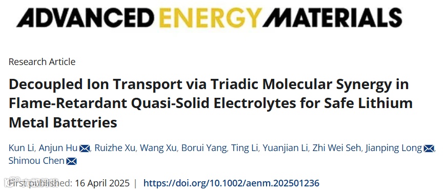 Decoupled Ion Transport via Triadic Molecular Synergy in Flame-Retardant Quasi-Solid Electrolytes for Safe Lithium Metal Batteries, Adv. Energy Mater., 2025, 2501236.