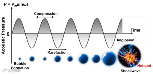 超声波在液体中传播时,会产生交替分布的正负压力区域。负压作用使液体中的气体或微小气泡膨胀,正压作用使气泡收缩。在正负压力的交替作用下,当气泡收缩至临界尺寸时,内部压力急剧升高,瞬间产生局部高温(≥ 5000 K)和高压(≥ 1000 atm),并在快速破裂时释放巨大能量,形成高速微射流。该过程产生的极端条件能够加速化学反应。同时,超声波的机械振动作用可增强反应物和产物的扩散与传输,促进反应的均匀进行。此外,声-压、声-机械、声-热等多重效应相互协同,共同作用于材料的合成过程。