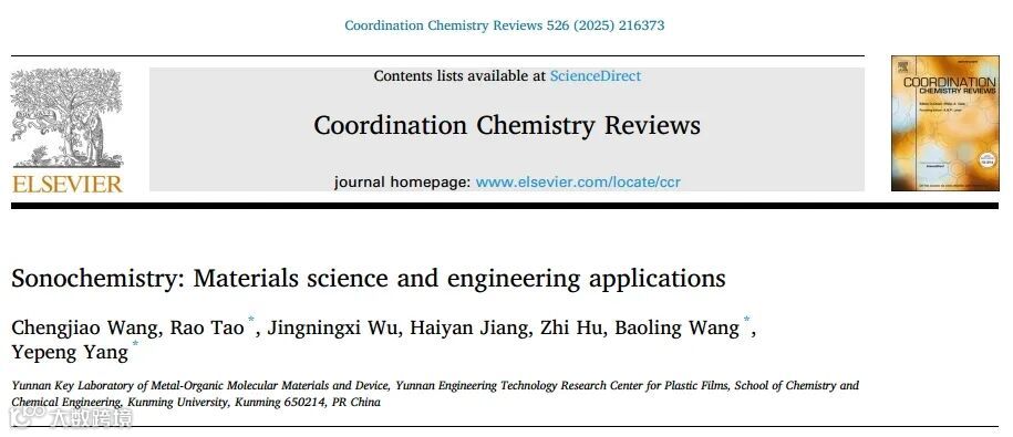 由于空化效应,超声波在介质中的传播能够产生局部高温高压,从而促进分子裂解、加速电荷转移,实现材料的快速构建,在功能材料的可控合成中受到了广泛关注。基于此,昆明学院杨烨鹏、陶娆团队在Coordination Chemistry Reviews上发表了题为:“Sonochemistry: Materials science and engineering applications” 的综述论文。文章重点阐述了超声化学在材料合成中的物理和化学效应,包括声-压、声-机械、声-热、声-自由基,并全面总结了超声化学技术合成的功能材料在催化、能源转化、环境治理、生物医学等领域的应用进展。最后,文章深入讨论了超声化学合成材料及其应用所面临的挑战,并对其未来发展方向进行了展望。