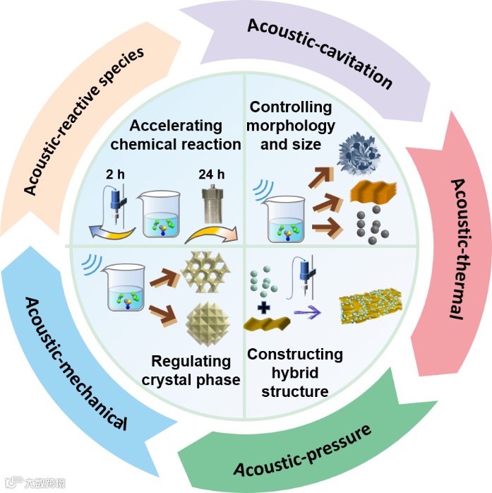 超声是一种频率高于20 kHz的机械波,在液体中传播时能够引发独特的声空化现象。利用声空化效应,可以在溶液里瞬间产生高速微射流、高温、高压等极端条件,从而打破传统反应的热力学和动力学限制,在材料制备领域备受关注。首先,声化学技术合成材料可以减少甚至避免使用有机溶剂,符合绿色化学原则;其次,超声技术引发的局域高温高压不仅有助于精确控制材料的组成结构和物理形貌,还能在晶体结构中引入独特的缺陷,从而显著提高材料性能;此外,通过超声振动加速原料均匀混合,加速材料制备过程,有利于实现功能材料的高通量制备。近年来,超声化学技术已广泛应用于无机材料、有机材料、碳材料、复合材料的高效制备。