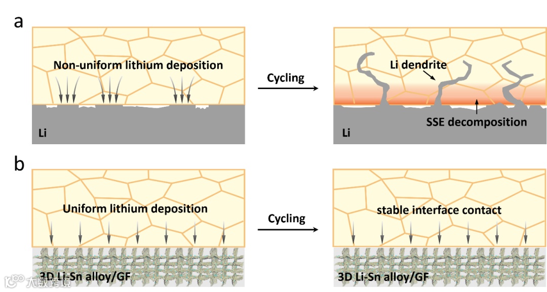 图1. 负极|SSE界面在电池循环期间的演变示意图。a) 负极|SSE接触不良导致锂沉积不均匀和锂枝晶生长,以及严重的固态电解质分解。b) 在 3D Li-Sn alloy/GF|SSE,合金骨架诱导锂离子沉积到负极体相中,可缓解体积膨胀并形成稳定的界面接触。