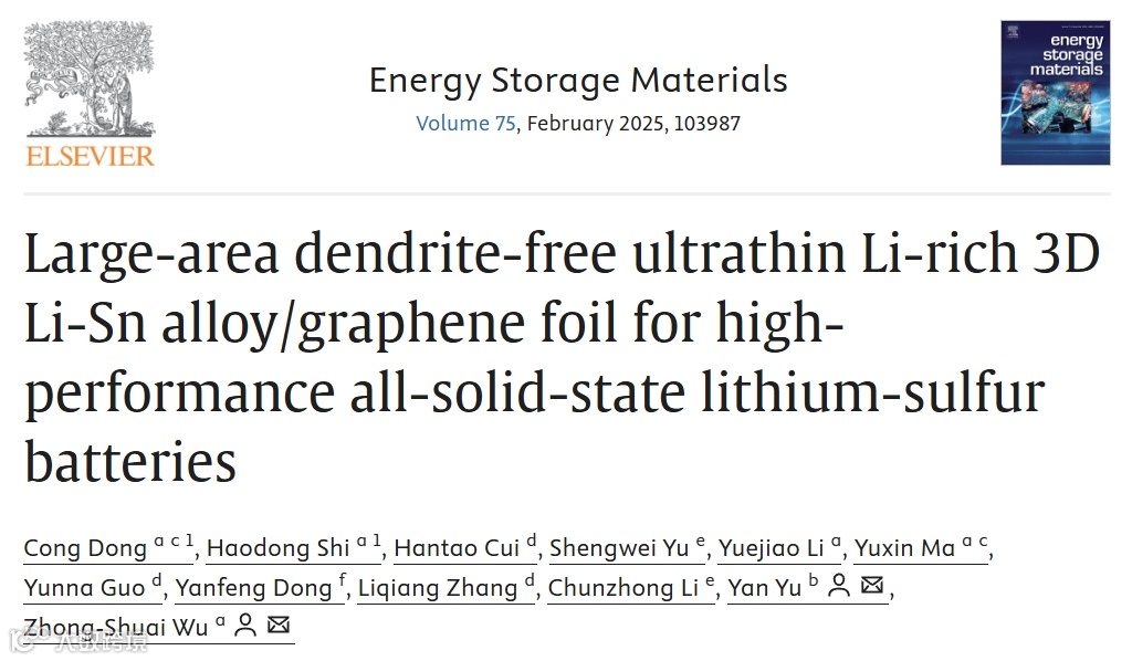 基于此,中国科学院大连化学物理研究所吴忠帅、中国科学技术大学余彦团队提出了一种大面积、超薄、无枝晶的富锂3D Li-Sn合金/石墨烯框架(GF)负极,用于高性能全固态锂硫电池(ASSLSBs)。该团队通过将熔融的Li-Sn合金注入到厚度可调的还原氧化石墨烯(rGO)膜中,合成了这种3D Li-Sn合金/GF负极。这种负极具有几个显著优势:首先,它富含亲锂的Li22Sn5成核位点,确保了更强的吸附能和更低的扩散能垒碍,从而减少了锂成核过电位并均匀化了锂沉积;其次,石墨烯框架的三维结构提供了高活性比表面积和稳定的锂剥离/沉积支架,使得锂离子在沉积过程中更倾向于内部沉积,并减轻了循环过程中的体积变化,确保了负极/固态电解质(SSE)界面的稳定接触;第三,富锂的三维结构金属锂网络可以作为负极的活性锂源,有助于恢复Li-Sn合金电位至锂金属,并保证高能量密度输出;最后,通过调整锂宿主的厚度,可以轻松控制所得3D Li-Sn合金/GF负极的厚度,范围从10到50微米,打破了商业化锂箔的限制。这一策略为开发下一代高安全性和高能量密度的锂金属全固态电池提供了新的思路。相关研究成果以"Large-Area Dendrite-Free Ultrathin Li-Rich 3D Li-Sn Alloy/Graphene Foil for High-Performance All-Solid-State Lithium-Sulfur Batteries"为题发发表于《Energy Storage Materials》,第一作者是董聪、石浩东。