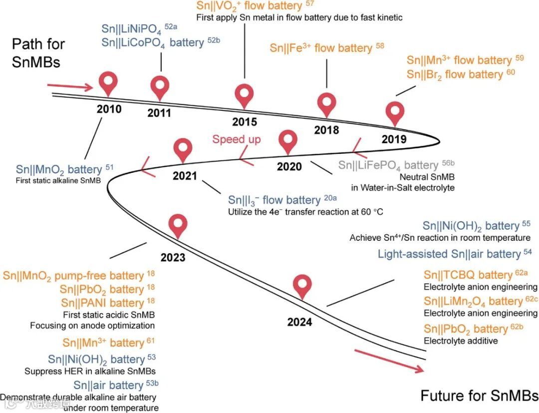 图3. 锡金属电池发展路线图及其代表性研究成果。蓝色代表碱性锡金属电池体系,灰色代表中性锡金属电池体系,红色代表酸性锡金属电池体系。