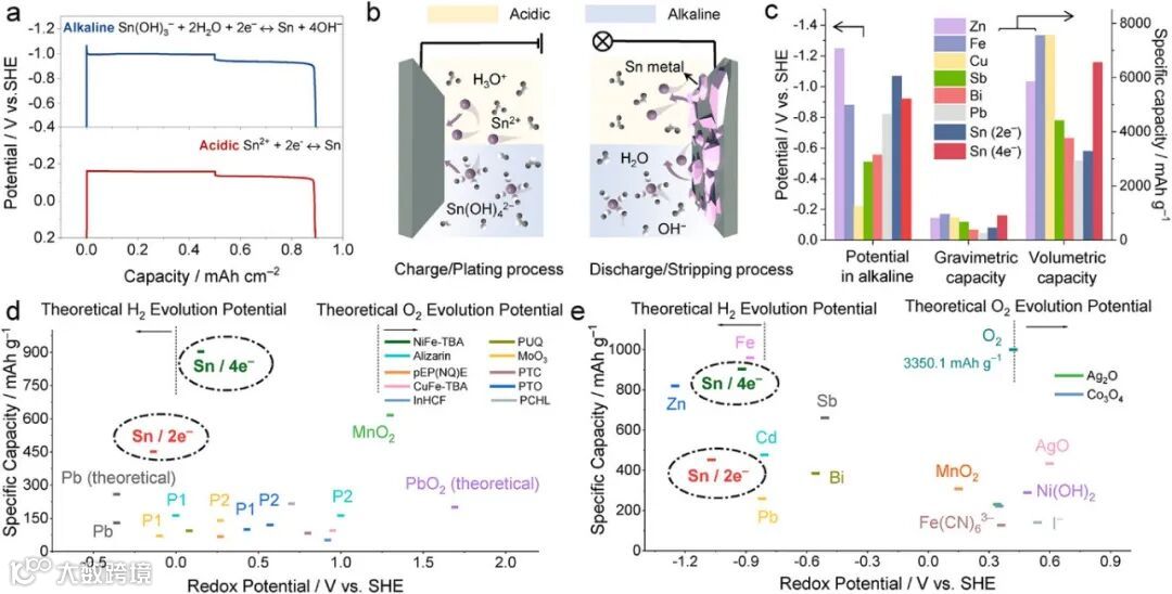 图2. a) 在典型酸性和碱性电解液中,电流密度为2 mA cm⁻²条件下锡金属负极的恒电流充放电曲线实验数据。b) 锡负极在酸性和碱性电解液中的储能机制示意图(图中省略了阴离子)。c) 水系电池典型金属负极的氧化还原电位,以及比重量容量和比体积容量。d) 酸性体系和 e) 碱性体系中锡金属负极及其他典型电极的氧化还原电位与比容量比较。其中P1和P2分别表示第一个和第二个平台电位。