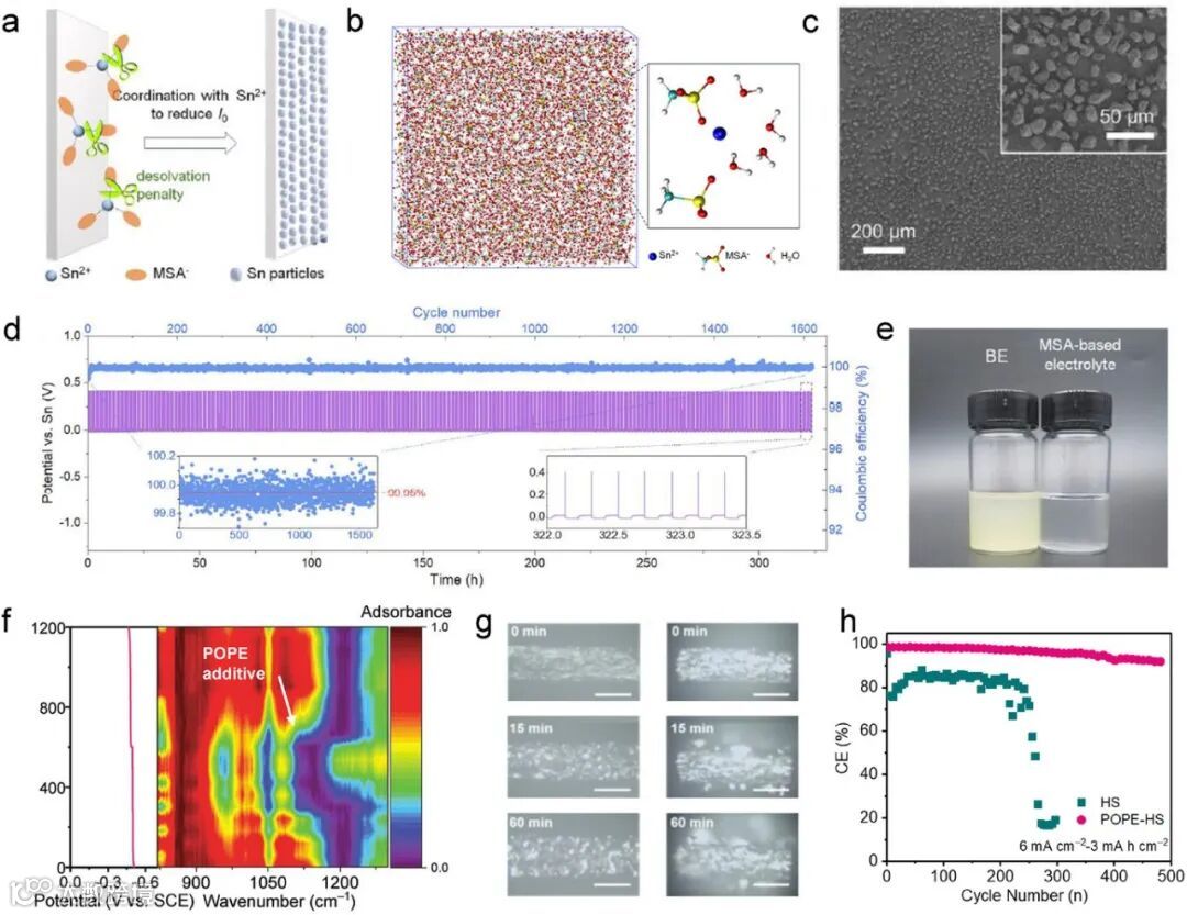 图6. a) 明胶形成的吸附层能够降低锡沉积的动力学速度,从而实现更均匀的沉积。b) 分子动力学模拟中基于MSA的电解液内Sn²⁺离子溶剂化结构的示意图。c) 在MSA基电解液中,以1 mAh cm⁻²容量沉积的锡的SEM图像。d) 在MSA基电解液中,锡在电流密度10 mA cm⁻²和容量1 mAh cm⁻²条件下的电化学沉积/剥离行为。e) 静置条件下,基于硫酸电解液一周后和基于MSA电解液一个月后的实物对比照片。f) 在添加POPE的酸性电解液中,锡沉积/剥离过程的FT-IR光谱。g) 在电流密度20 mA cm⁻²条件下,不同沉积时间后,含POPE电解液(左)和普通酸性电解液(右)中锡沉积的原位光学照片(比例尺:50 µm)。h) 在硫酸基电解液中,以电流密度6 mA cm⁻²、容量3 mAh cm⁻²条件下锡沉积/剥离过程的库伦效率。