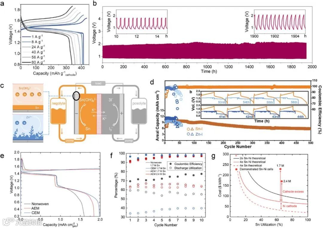 图9. a) Ni(OH)₂//Sn锡金属电池在不同倍率下的充放电曲线;b) 空气//Sn锡金属电池在5 mA cm⁻²电流密度和1 mAh cm⁻²容量条件下的循环性能;c) 基于四电子转移机制的传统锌-碘氧化还原液流电池与锡-碘液流电池的示意图对比;d) 在60 °C、5 mA cm⁻²条件下,静态Sn–I电池和Zn–I电池的面容量及库伦效率保持情况;e) 使用不同隔膜的Ni(OH)₂//Sn软包电池在1 mA cm⁻²电流密度、2 mAh cm⁻²容量条件下的电压曲线;f) 软包电池在电解液中锡总量基础上的库伦效率和锡利用率保持情况;g) 不同锡电池化学体系下,锡负极利用率与能量成本的关系曲线。