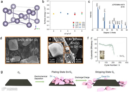 图4. a) β-Sn的晶体结构(JCPDS#04-0673)。b) 已报道的锡金属不同晶面表面能。c) 锡金属的理论标准X射线衍射图谱。d) 使用Sn(II)盐在碳基底上电沉积锡的扫描电子显微镜(SEM)图像。e) 使用Sn(IV)盐在碳基底上电沉积锡的扫描电子显微镜(SEM)图像。f) 在酸性电解液中,碳基底上锡沉积的库伦效率g) 碳基底上锡沉积/剥离过程的示意图。