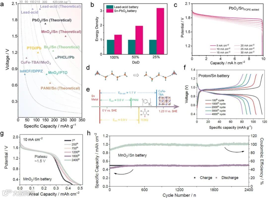 图8. a) 基于正负极材料质量负载,典型锡金属电池与其他水系酸性电池的电池电压、比容量和能量密度比较。b) 在不同负极放电深度条件下,PbO₂//Sn电池与传统铅酸电池的能量密度对比。c) 含POPE电解液添加剂的PbO₂//Sn电池在不同电流密度下的恒电流充放电曲线,充电容量固定为10 mAh cm⁻²。d) 质子传输过程中的Grotthuss机制示意图。e) 最近报道的质子电池正极材料电压与质子//Sn电池理论电压对比。f) 以质子电池正极材料TCBQ为正极的TCBQ//Sn电池在6 A g⁻¹电流密度下的典型充放电曲线。g) 泵循环方式下的MnO₂//Sn电池在10 mA cm⁻²电流密度、0.5 mAh cm⁻²固定充电容量条件下,不同循环次数的放电曲线。h) 在10 mA cm⁻²电流密度下MnO₂//Sn电池的长期循环性能。