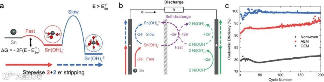 图7. a) 提出的锡剥离(溶解)过程机理示意图,展示了由于连续电子转移过程中反应速率不同,锡以分步的2 + 2电子方式实现总共四电子转移。b) 基于四电子转移机制的Ni(OH)₂//Sn电池的工作原理示意图。其中紫色箭头表示可溶性中间产物Sn(OH)₃⁻的穿梭效应所引发的电池自放电现象。c) 使用不同隔膜的电池在长时间循环测试过程中库伦效率的对比。