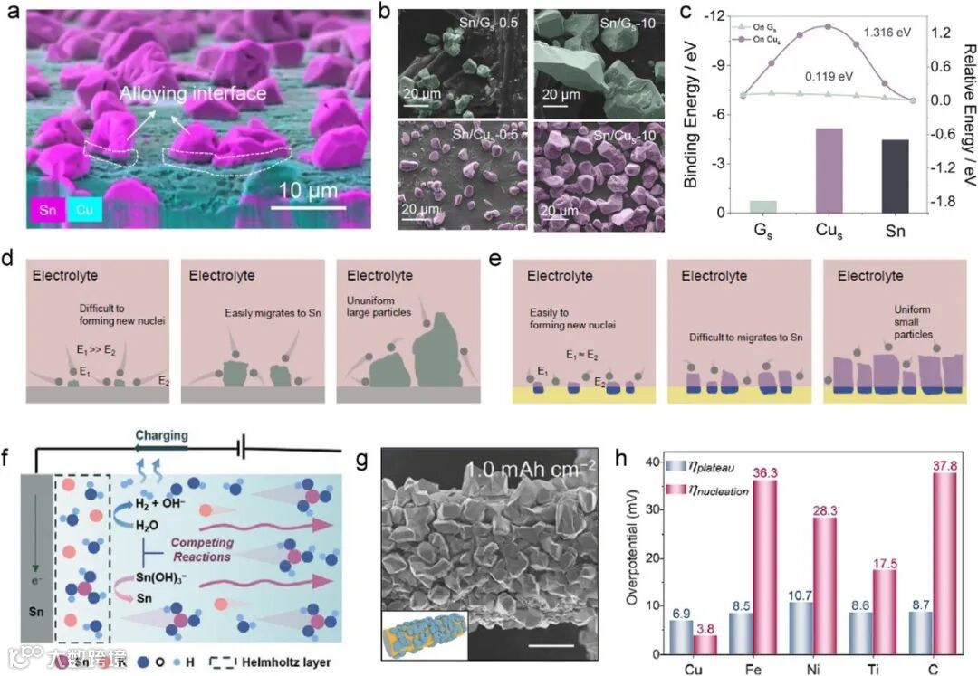 图5. a)为铜基底上锡沉积的侧面扫描电子显微镜(SEM)图像及相应的EDS元素分布图(沉积容量为0.5 mAh cm⁻²),重点聚焦锡与铜的界面;b)展示了锡分别在碳和铜基底上不同沉积容量(0.5和10 mAh cm⁻²)条件下的SEM图像;c)显示了理论计算所得Sn²⁺在石墨、铜和锡表面的结合能(下图)和扩散能垒(上图);d)和e)分别示意了锡金属在碳基底和铜基底上的沉积过程,其中蓝色区域表示锡与基底之间的界面合金化作用,E1和E2分别代表锡在锡晶核和基底上的结合能绝对值;f)展示了锡箔在碱性环境中的电沉积机制,其中氢析出反应与锡沉积过程相互竞争,箭头表示Sn(OH)₃⁻离子的扩散方向;g)为碱性电解液中铜基底上锡沉积的SEM图像;图h)则比较了锡在不同基底上的成核过电位与平台过电位。