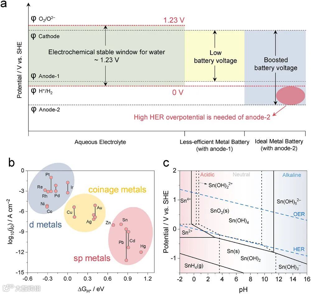 图1. a) 水系电解液的电化学稳定窗口。负极材料对析氢反应(HER)的过电位能够扩展实际的电化学工作电压窗口。b) 不同金属表面在酸性水溶液中的HER活性比较。在酸性和碱性介质中的趋势类似。实验测得的HER活性以交换电流密度log(j₀)表示,为计算所得的氢原子(H*)吸附吉布斯自由能(ΔG_H*)的函数。c) 298 K下H₂O–Sn体系的电位-pH图(Pourbaix图)。锡的溶解态活度为10⁻⁶,锡烷气体分压p(SnH₄)=1。实线表示固相与相邻物种之间的平衡边界,虚线表示锡的溶液物种在相邻两区域中等量分布的条件。