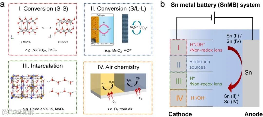图10. 不同类型阴极(I到IV)锡金属电池工作过程的示意图。图中左侧面板阴极附近所示的离子类型对应于各个阴极类型在电解液中所需的特定离子,其中“S”表示固相,“L”表示液相。