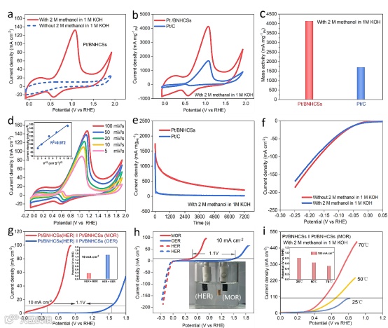 图4.a)Pt/BNHCs在含甲醇和不含甲醇的1 M KOH溶液中催化MOR的循环伏安曲线; b)Pt/BNHCs和商业Pt/C在含甲醇的1 M KOH溶液中催化MOR的循环伏安曲线; c)Pt/BNHCs和商业Pt/C在MOR中的质量活性;(d)不同扫描速率下Pt/BNHCSs催化MOR的CV曲线;e,f)Pt/BNHCSs和商品Pt/C催化MOR的稳定性,g)Pt/BNHCSs在1 MKOH溶液中催化MOR和OER的LSV曲线; h)Pt/BNHCSs同时催化HER和MOR偶联体系的LSV曲线(红线:有甲醇的电解液,蓝线:无甲醇的电解液); i)Pt/BNHCSs在不同温度下催化MOR的LSV曲线。