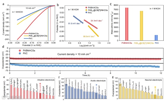 图3.a)由Pt/BNHCSs、Pt/B10@CB[7]/NHCSs和Pt/C(20 wt%)在1 M KOH溶液中催化的HER的LSV曲线; b)由Pt/BNHCSs、Pt/B10@CB[7]/NHCSs和Pt/C(20 wt%)在1 M KOH溶液中催化的HER的塔菲尔斜率,c)由Pt/BNHCSs、Pt/B10@CB[7]/NHCSs、Pt/B10@CB[7]/NHCSs催化的HER的质量活性,和Pt/C(20wt%)在1 M KOH溶液中的稳定性; d)Pt/BNHCSs和Pt/C(20wt%)在0.5M H2SO4溶液中的长期催化HER的稳定性。