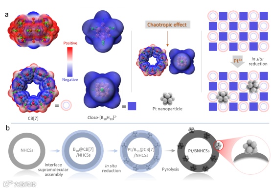以中空碳球(NHCSs)为基底,通过将还原剂硼簇(closo-[B10H10]2-)直接引入到框架中,通过构建硼簇和葫芦脲(CB[7])的超分子组合来构建还原性超分子。该还原性超分子能有效地促进Pt4+在NHCSs基底上原位转化为高度分散的小尺寸纳米铂,经过高温退火后形成Pt/BNHCSs。
