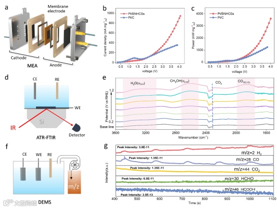 图5.a)膜电极组件(MEA)的电解池的组成; b,c)当同时催化HER和MOR时MEA中的Pt/BNHCSs和商业Pt/C的LSV曲线, b是质量归一化活性,c是功率密度,d)原位电化学ATR-FTIR测试原理; e)当Pt/BNHCSs催化MOR时的原位电化学ATR-FTIR信号;f)在线电化学DEMS测试原理; g)Pt/BNHCS催化MOR和HER时,在线电化学DEMS信号。