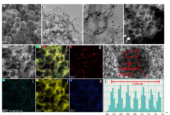 图2. a)Pt/BNHCSs的SEM图像;b,c)Pt/BNHCS的TEM图像;d,e)Pt/BNHCSs的HAADF图像; f-j)Pt/BNHCSs中的元素分布; k,l)Pt/BNHCSs中Pt纳米颗粒的高分辨率TEM图像和晶格间距。