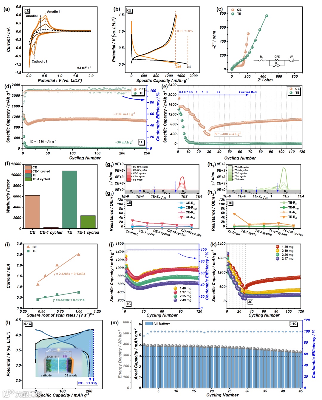EIS和CV测试用于分析电极的电荷传输阻抗和Li+扩散行为,结果显示,CE的SEI结构更稳定,对电荷传输过程的阻碍较小。新鲜TE的Warburg因子几乎是新鲜CE的1.74倍,且在循环后增加到循环CE的11.02倍,表明CE在新鲜状态和SEI形成后具有更快的Li+扩散速度。循环充放电显示,CE和TE在0.1C的初始放电容量分别为1819.3 mAh g−1和1530.5 mAh g−1,但TE在1C下的前10圈内容量迅速下降至几乎可以忽略不计,而CE在1C下维持了约1100 mAh g−1的稳定放电容量,表明一体化结构保证了更好的循环稳定性。CE和TE在3.0 mg的高负载下进行对比测试。结果显示,TE在0.2C和0.1C下几乎无法提供锂存储容量,而CE表现出超稳定的循环稳定性,在0.2C下经过140圈循环后仍能保持约1100 mAh g−1的容量,并且在0.1C下提供了3.11 mAh cm−2的令人印象深刻的面积容量,与NCM-811正极匹配的全电池实现了高达91.33%的初始库仑效率(ICE)和204.4 mAh g−1的放电容量,这对于Si基负极来说是难以实现的,尤其是在高活性材料比例(约95 wt.%)的情况下。突显了其在高能量密度电池系统中的潜力。