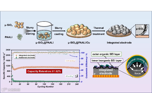 为了解决硅负极的问题,研究者们尝试了多种改性方法,如纳米化、多孔结构设计、复合材料制备等。但这些方法在一定程度上存在局限性,例如纳米化硅负极的导电性较差,多孔结构的稳定性不足等。来自湖南大学的叶崇研究员和季华实验室的张成智博士、谭军研究员针对硅负极的体积变化问题展开了研究。论文提出了一种一体化电极结构的构建方法。通过在硅负极表面进行原位电极尺度的共形涂覆,形成一种超稳定的集成负极结构,其中硅氧化物(SiOx)含量约为95 wt.%。这种结构能够有效缓解硅负极在充放电过程中的体积膨胀问题,提高电极的稳定性和循环寿命。通过有限元分析、原位拉曼和溅射X射线光电子技术等对一体化结构的作用机理进行了研究。研究发现,一体化电极结构可以通过电极尺度上的共形涂敷缓冲体积膨胀、增强界面稳定性而提升结构稳定性,通过优化的电子传输路径和促进锂离子传输而改善电极导电性,通过隔离电解液和调控固体电解质界面(SEI)结构抑制电池副反应,最终实现电极结构优化,保证高活性物质利用率,促进硅负极的容量发挥。上述成果以题为“An Ultrastable Integrated Anode with ∼95 wt.% SiOx via In Situ Electrode-Scale Conformal Coating”在国际知名期刊ACS Nano发表。湖南大学-季华实验室联合培养博士生王宇辰为本文的第一作者。