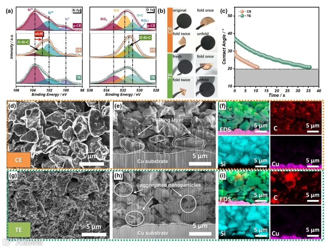 一体化电极(CE)是通过将初始粘结剂和活性材料涂敷在集流体上后在较低温度下进行热处理(500℃)而获得的,并采用混合了纳米导电剂、粘结剂和活性颗粒通过涂敷-干燥制备的传统涂敷电极(TE)作为对比样,来探究一体化电极结构的该型机理。在热处理过程中,前驱体中的粘结剂原位转化为在活性颗粒表面共形包覆的碳化层,并在电极尺度上连接成三维骨架。通过XPS和FIB-SEM证明,传统电极结构中,纳米级颗粒(CAs/粘结剂)聚集在微米级SiOx颗粒之间的空隙中,导致活性层中电解液渗透和Li+传输路径较长。而一体化电极内的碳化层与活性颗粒之间形成了强化学键,涂层层在活性颗粒和集流体之间建立了三维互连的导电和机械框架,改善了电极的内部结构和导电性。EDS和2D-Raman结果显示,一体化电极中C和Si的元素分布更加均匀,表明粘结剂热解衍生的涂层在活性颗粒和集流体之间建立了三维互连的导电和机械框架,改善了电极的内部结构和导电性。