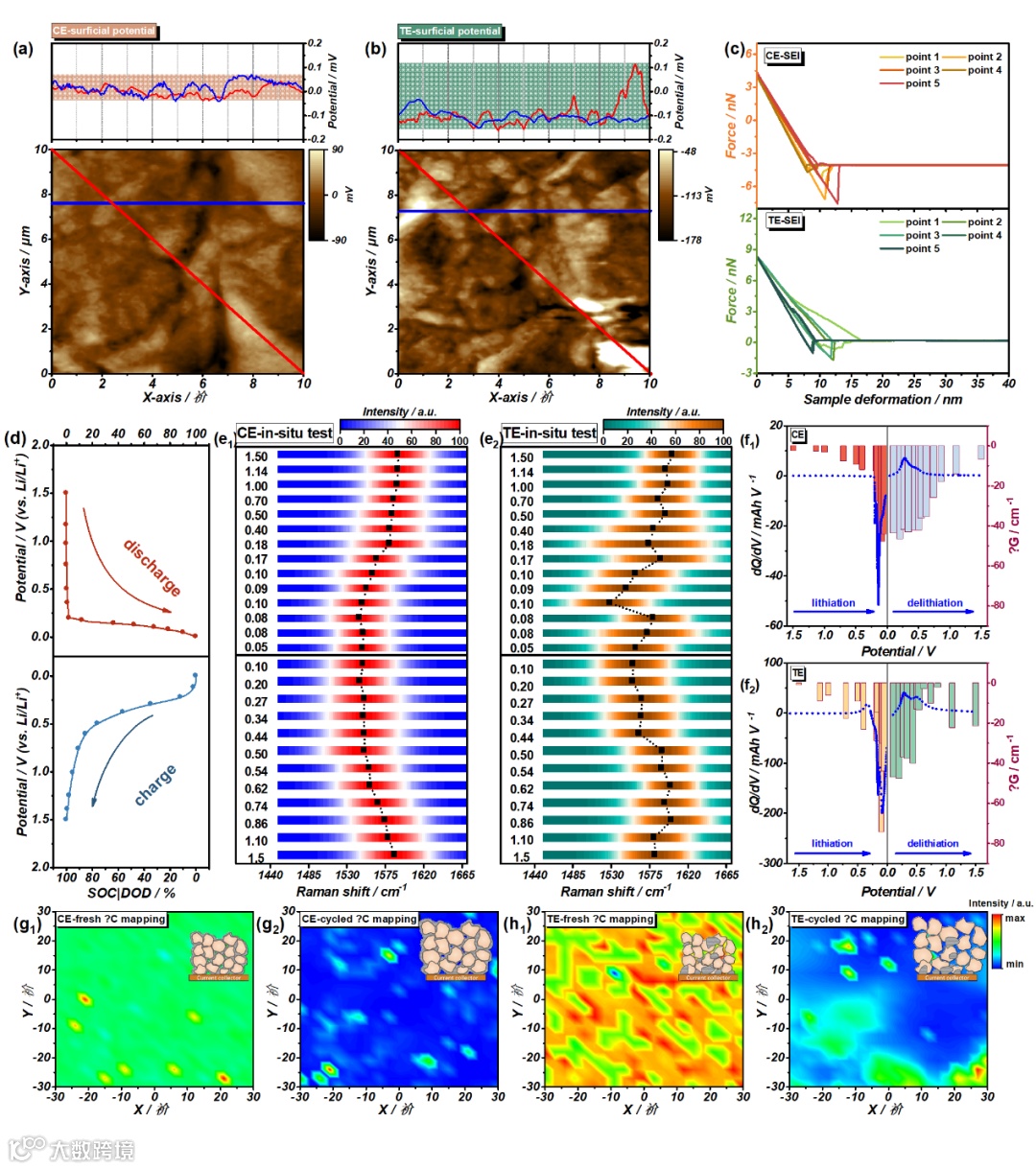 为了揭示一体化电极结构的作用机制,作者进行了扫描开尔文探针显微镜(SKPM)测试,用于获取电极的表面电势分布图像。结果显示,CE表现出更均匀的表面电势分布,而TE出现了局部富集的电荷趋势。此外,CE的表面电势比TE更正,这有助于减少电解液还原的风险,形成更薄的SEI,并减少副反应。并通过非原位XPS和溅射XPS对初始和稳定SEI结构进行了测试和表征,证明CE上形成的SEI更薄、更紧凑,具有明显的“外有机、内无机”的特征,表现出更强的机械特性,足以使活性表面充分钝化,并有助于电极结构完整性。