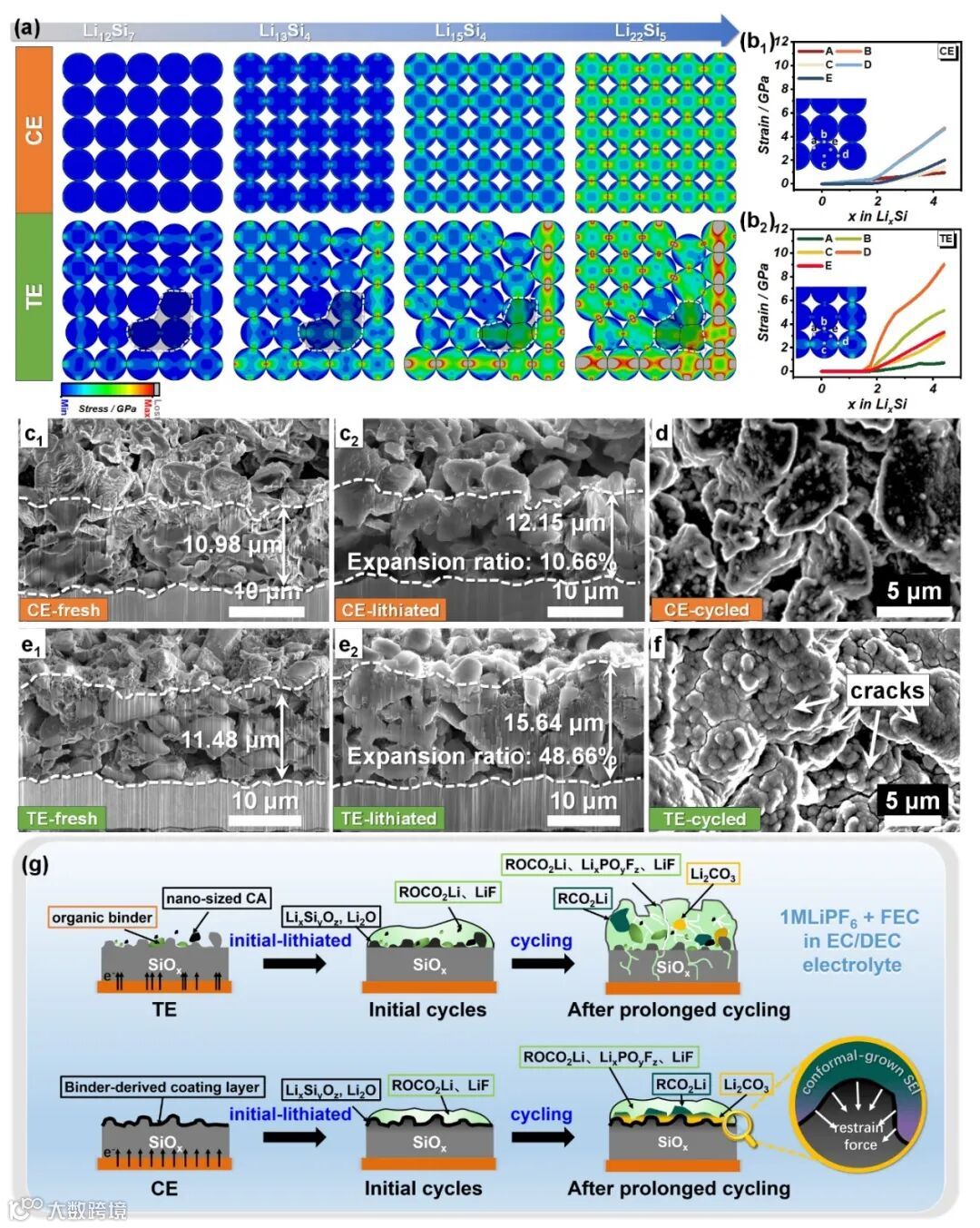 为了揭示一体化电极结构对活性层体积膨胀的限制作用,作者采用了有限元模拟分析用于比较CE和TE的结构稳定性。模拟中构建了两个模型:第一个是具有连续碳涂层的Si颗粒,第二个是Si颗粒中随机分布的C颗粒(CAs).模拟结果显示,在Li/Si比升高时,TE中Si部分的体积膨胀产生应力,持续压缩C部分,导致Si颗粒在C区域附近的应力聚集,而其余部分相对较小。这导致活性层内发生显著的成分重排,导致循环过程中电极表面开裂和活性颗粒从导电组分中脱落。相比之下,CE在整个锂化状态下实现了更温和的应力演变和均匀的应力分布。有限元分析结果清楚地描述了集成电极中热解形成的三维机械框架的应力缓解效应,即,CE中的机械应力在颗粒内和电极内均表现出均匀分布,有效防止了长期循环中的颗粒粉碎。这一发现对解决硅负极体积膨胀问题具有重要参考意义。