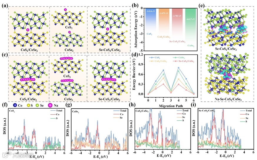 理论计算结果表明基于电子结构工程的Se-CoS2和界面工程的Se-CoS2/CoSe2的双重效应,材料的导电性显著提升,电荷转移速度加快。同时,合适的钠吸附能和较低的迁移能垒进一步加快了储钠动力学过程,最终实现高效储钠。