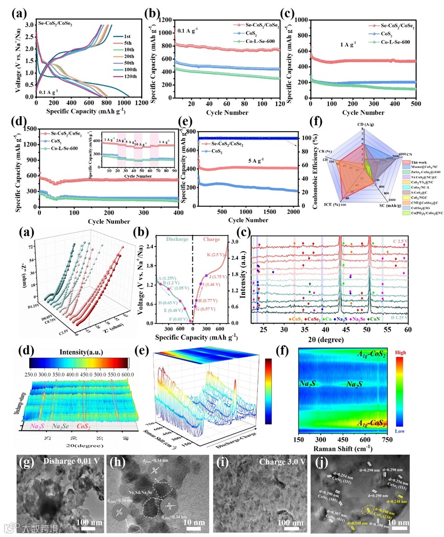 得益于Se诱导的电子结构和界面协同效应,优选的Se-CoS2/CoSe2复合材料作为钠离子负极材料时不仅表现出优异的长循环稳定性,同时还具有突出的倍率性能。此外,异位EIS/XRD/TEM和原位Raman测试结果进一步揭示了该复合材料的储钠机制。
