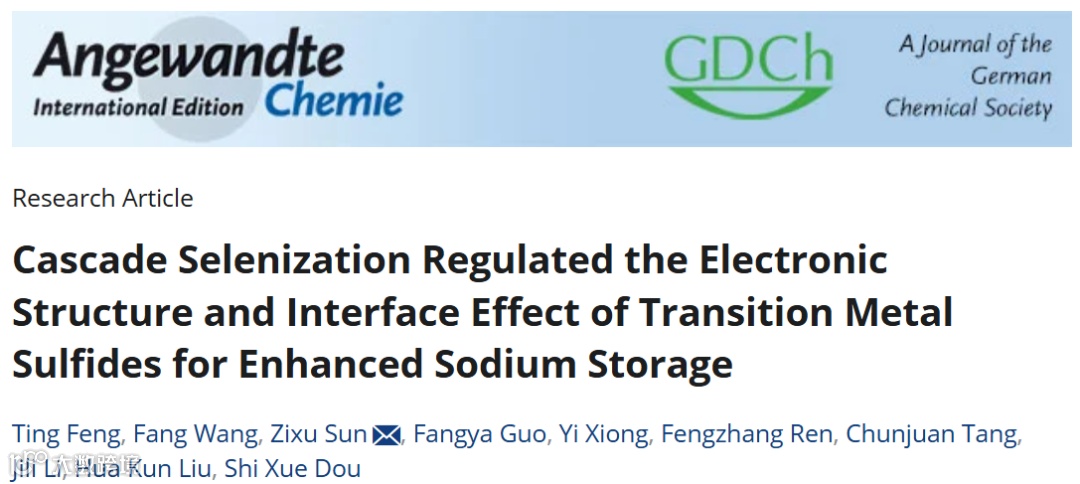 基于此,河南科技大学的任凤章教授与洛阳理工学院的王芳教授、河南大学的孙自许教授和上海理工大学的窦世学教授/刘化鹍教授合作,在国际知名期刊Angew. Chem. Int. Ed.上发表题为“Cascade Selenization Regulated the Electronic Structure and Interface Effect of Transition Metal Sulfides for Enhanced Sodium Storage”的观点文章。该观点文章报道了一种逐级Se化实现界面与电子结构双向调控的策略,显著提升了CoS2本征电导率,同时构建的同源钴基异质结进一步增强了材料的界面效应和储钠活性。实验结合理论计算结果证实这种特殊异质结构Se-CoS2/CoSe2的形成过程为:一步硫硒化过程中优先形成CoS2组分。随后,Se逐步取代CoS2中的S位点,富Se区以完全取代产物CoSe2为主,缺Se区以不完全取代Se-CoS2为主。得益于这种基于Se-CoS2的电子结构调控和CoS2/CoSe2异质结间的界面调控,优选的复合材料表现出突出的倍率性能和高的储钠容量。该研究为提升低电导率活性材料和新型异质结构的设计提供了思路。