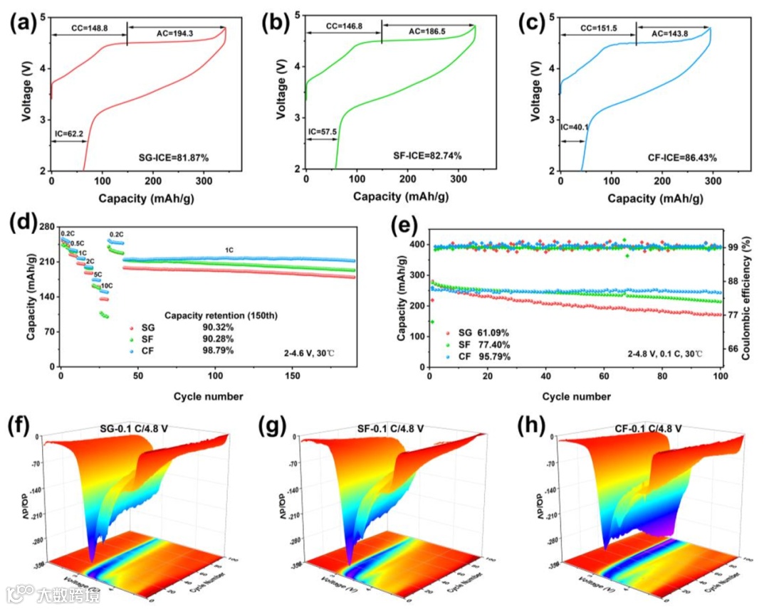图3. (a) 本体SG、(b) SF和(c) CF的初始充电/放电曲线;(d) 所有样品的倍率性能和(e) 循环性能;(f) SG、(g) SF和(h) CF放电过程中的相应dQ/dV曲线