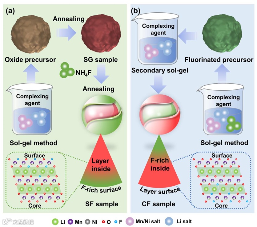 提出了一种新型的反向氟浓度梯度设计,通过二次溶胶-凝胶法成功制备了具有反向氟浓度梯度的富锂层状氧化物正极材料(CF)。这种设计的核心在于氟浓度从颗粒中心向表面线性增加,与传统的表面氟化(SF)形成鲜明对比。在SF样品中,氟主要集中在表面,形成一层薄的LiF层,虽然能够改善表面的机械强度和稳定性,但可能会对锂离子的传输产生阻碍作用。而CF样品通过特殊的制备工艺,使得氟在颗粒内部富集,从而在材料内部形成氟浓度梯度。这种梯度设计不仅优化了锂离子在颗粒内部的传输路径,减少了锂离子浓度梯度引起的内部应力,还显著提升了材料的整体结构稳定性。通过XRD、HRTEM、XPS等多种表征手段,研究人员确认了CF样品中氟的分布情况,以及这种分布对材料微观结构和性能的影响。这种反向氟浓度梯度的设计为高性能锂离子电池正极材料的开发提供了新的思路,尤其是在处理低溶解度元素和易形成钝化层的材料时,展现出广阔的应用前景。