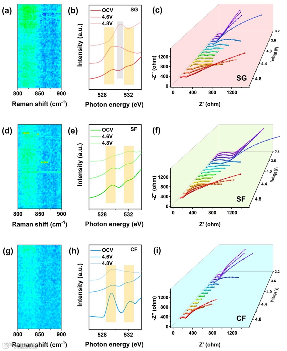 图4. 原位拉曼光谱(a) SG、(d) SF和(g) CF对应于2次充电过程;(b) SG、(e) F和(h) CF在不同电压下的O边、K边;(c) SG、(f) SF和(i) CF在不同SOC下的阻抗图