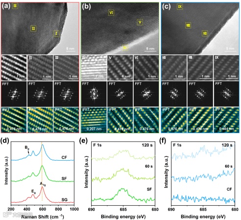 图2. (a)SG、(b)SF和(c)CF正极的HRTEM和对应的FFT/iFFT图像;(d)拉曼光谱;(e)SF和(f)CF样品的XPS深度分析