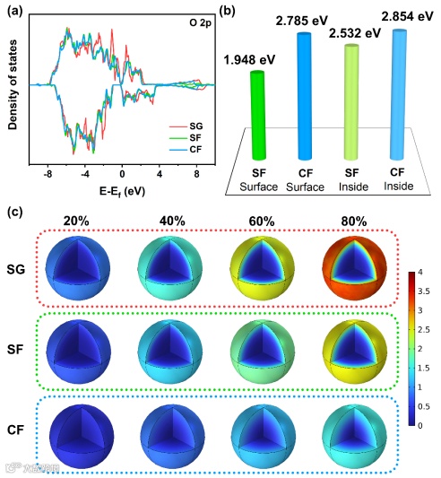图5. (a)O 2p轨道态密度;(b)氟化样品在不同深度的氧空位形成能;(c)样品在不同SOC下的应力分布情况