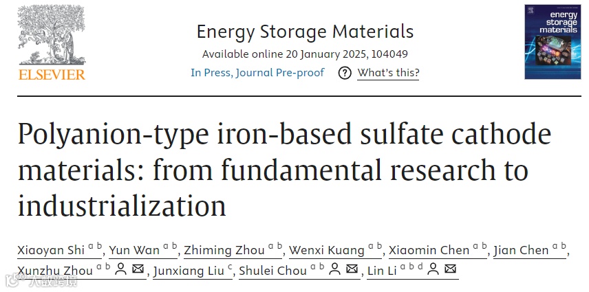 近日,温州大学侴术雷教授、李林特聘教授、周洵竹博士在国际知名期刊Energy Storage Materials上发表题为“Polyanion-type iron-based sulfate cathode materials: from fundamental research to industrialization”的综述。该综述首先概述了铁基硫酸盐正极材料的发展历史和最新进展,随后总结了目前钠离子电池铁基硫酸盐聚阴离子正极材料的产业化进展。最后全面总结了铁基硫酸盐的改性策略以及未来的发展方向。