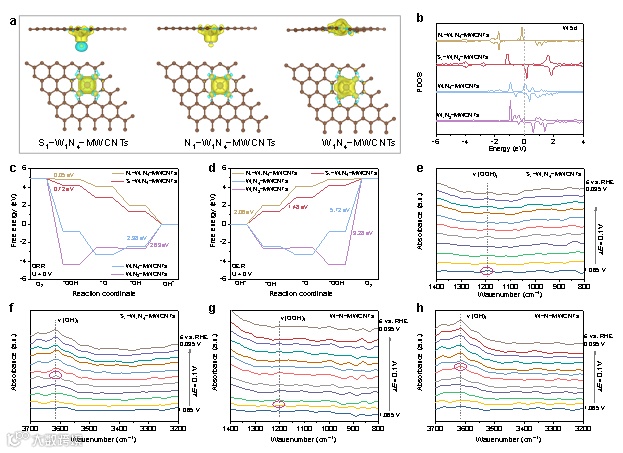 图4. S1−W1N4−MWCNTs催化剂的DFT计算数据与原位红外光谱数据