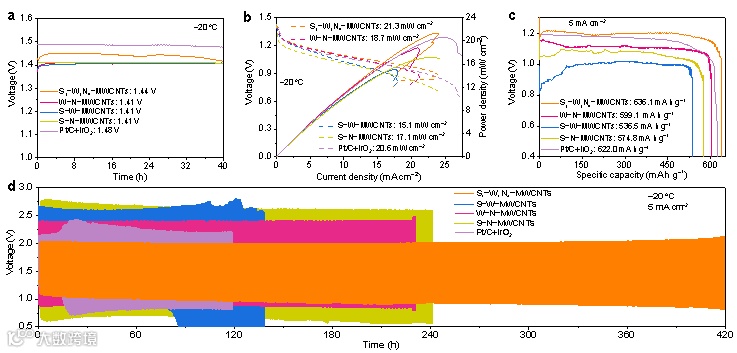 作为阴极催化剂,S1−W1N4−MWCNTs使准固态锌-空气电池在−20 °C条件下表现出比Pt/C与IrO2商用催化剂更高的功率密度、比容量以及充放电循环稳定性。