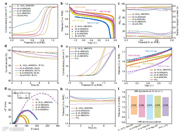 图3. S1−W1N4−MWCNTs催化剂的ORR活性:(a)LSV曲线、(b)Tafel斜率、(c)电子转移数与过氧化氢产率、(d)稳定性测试;及OER活性数据(e)LSV曲线、(f)Tafel斜率、(g)EIS曲线图、(h)稳定性测试;(i)ORR/OER双功能活性对比