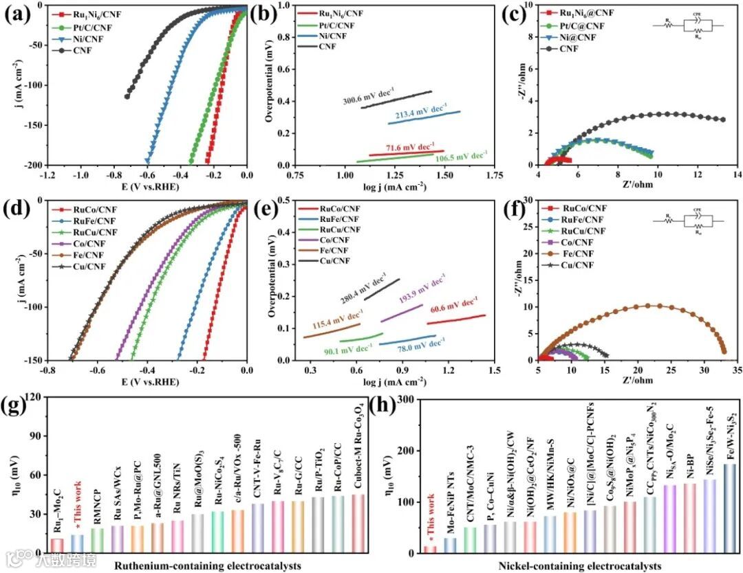 图4:Ru1Ni6/CNF催化剂的酸性析氢性能以及RuCo/CNF,RuFe/CNF和RuCu/CNF的碱性析氢性能。