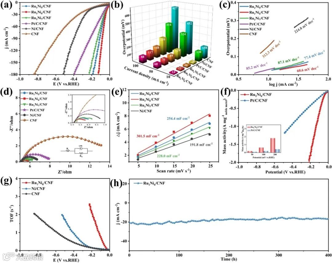 图3:Ru1Ni6/CNF催化剂的碱性析氢性能。