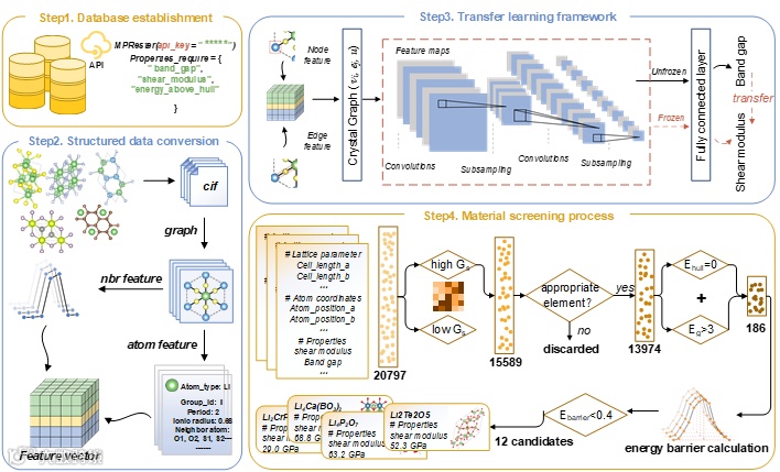 为了克服这一挑战,上海交通大学人工智能与微结构实验室李金金团队(AIMS Lab)提出了一种创新的方法—基于横向迁移学习(Lateral Transfer Learning)的材料筛选框架,结合了晶体图卷积神经网络(CGCNN)。这一工作具有深远的意义,不仅为固态电池的快速材料筛选提供了一条可行的路径,还在材料科学领域内展示了人工智能技术在高效筛选和优化材料方面的巨大潜力。该论文的第一作者为AIMS Lab博士生陶科豪。论文发表在Energy Storage Materials