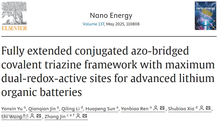 近日,来自枣庄学院的青年教师于延新博士与南京大学的金钟教授合作,在国际知名期刊Nano Energy上发表题为“Fully extended conjugated azo-bridged covalent triazine framework with maximum dual-redox-active sites for advanced lithium organic batteries”的研究性文章。该文章提出了以储锂活性单元直接与三嗪环连接用于兼具优异电导率与高比容量CTFs构建的新策略。